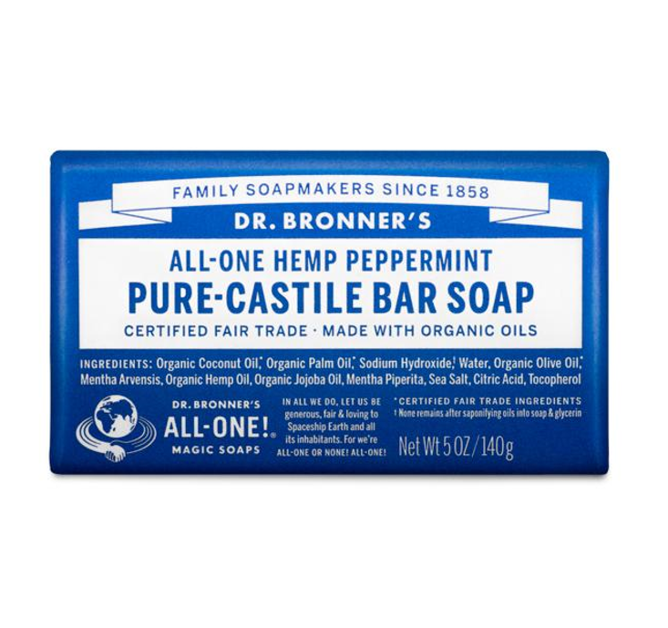 Dr. Bronner's Pure Castile Bar Soap Peppermint is my go-to soap for clean and refreshed skin. The peppermint scent is heavenly and the soap lathers up nicely for a thorough clean. I love that it is made with fair trade ingredients and is biodegradable. Plus, their customer service is amazing!