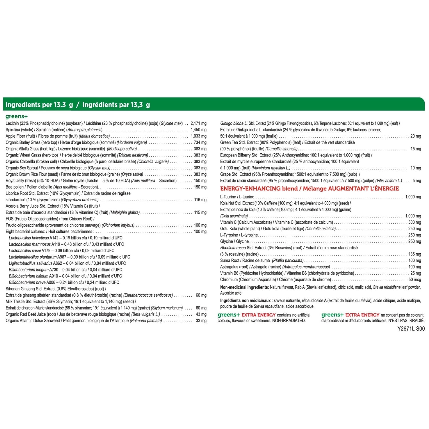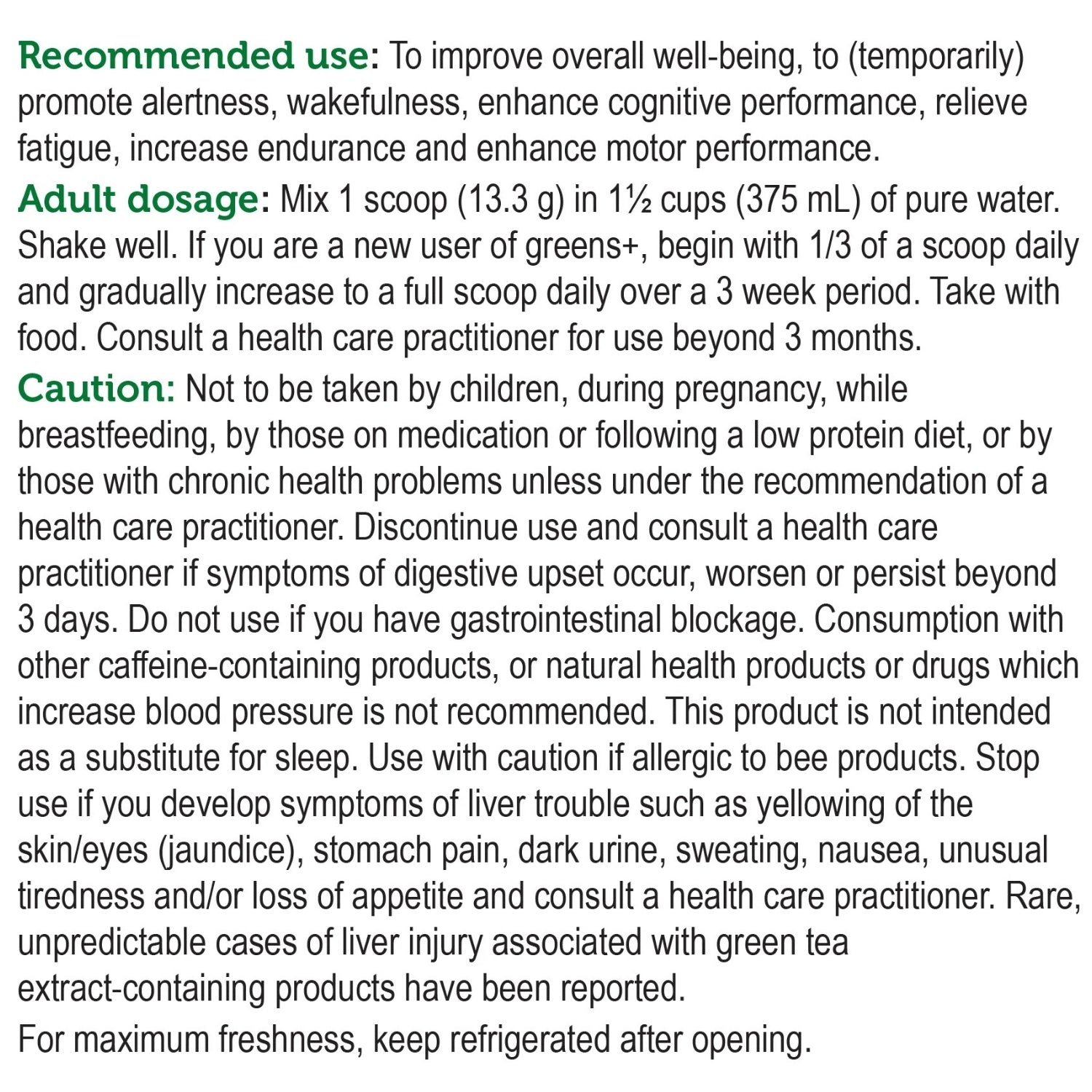 Taurine1000mgKolanut seed extract (standardized to 10% naturally occurring caffeine)800mgVitamin C (calcium ascorbate)500mgGotakola herb powder250mgL-Tyrosine250mgGlycine250mgRhodiola rosea root extract (standardized to 3% rosavin)135mgSumaroot powder100mgAstragalus root powder100mgVitamin B6 (pyridoxine HCl)25mgChromium (aspartate)50mcgOther ingredients:Naturalflavour blend with stevia1.34gCitric Acid120mgMalicAcid120mgNutritional information: Per 8.5g serving of greens+*:Calories41.62Fat2.10gProtein1.89gCarbohydrates3.92gDietary Fibre1.11gSugars0.51gSodium32.24mg*Includes greens+ flavoured and unflavoured.Adult Dosage: Mix 1 scoop (13.6g) of greens+ extra energy to one and a half cups (375mL) of pure water. Shake well. If you are a new user of greens+, begin with 1/3 scoop daily and gradually increase to a full scoop daily over a 3 week period.