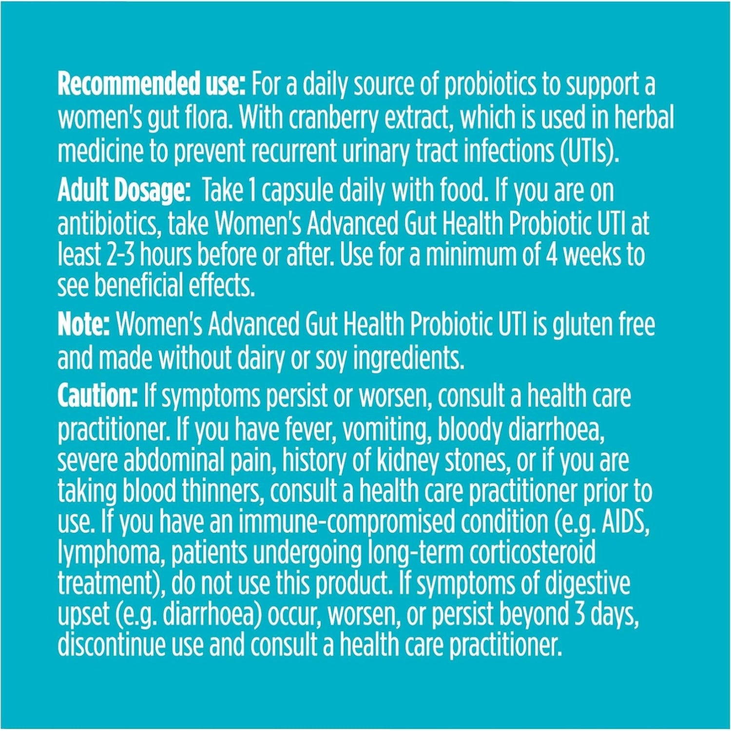 For a daily source of probiotics to strengthen a woman’s gut flora and support urinary tract and immune system health.Dosage: Take 1 capsule daily with food. If you are on antibiotics, take Women’s Advanced Gut Health Probiotic UTI at least 2-3 hours before or after. Use for a minimum of 4 weeks to see beneficial effects.advanced gut health probiotic is vegan and gluten-free. Made without dairy or soy ingredients.Caution: If symptoms persist or worsen, consult a health care practitioner. If you have fever, vomiting, bloody diarrhea, severe abdominal pain, history of kidney stones, or if you are taking blood thinners, consult a health care practitioner prior to use. If you have an immune-compromised condition, do not use this product. If symptoms of digestive upset (e.g. diarrhea) occur, worsen, or persist beyond 3 days, discontinue use and consult a health care practitioner.Store in a cool place. For maximum potency, keep refrigerated, however refrigeration is not required.