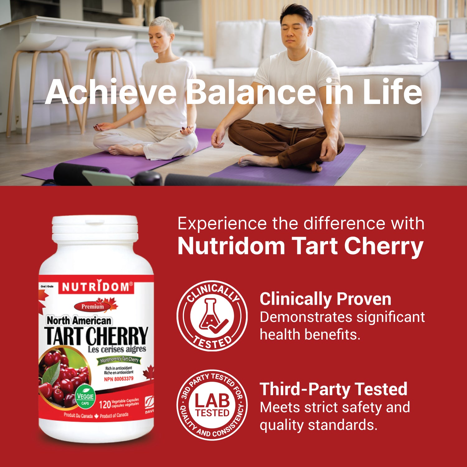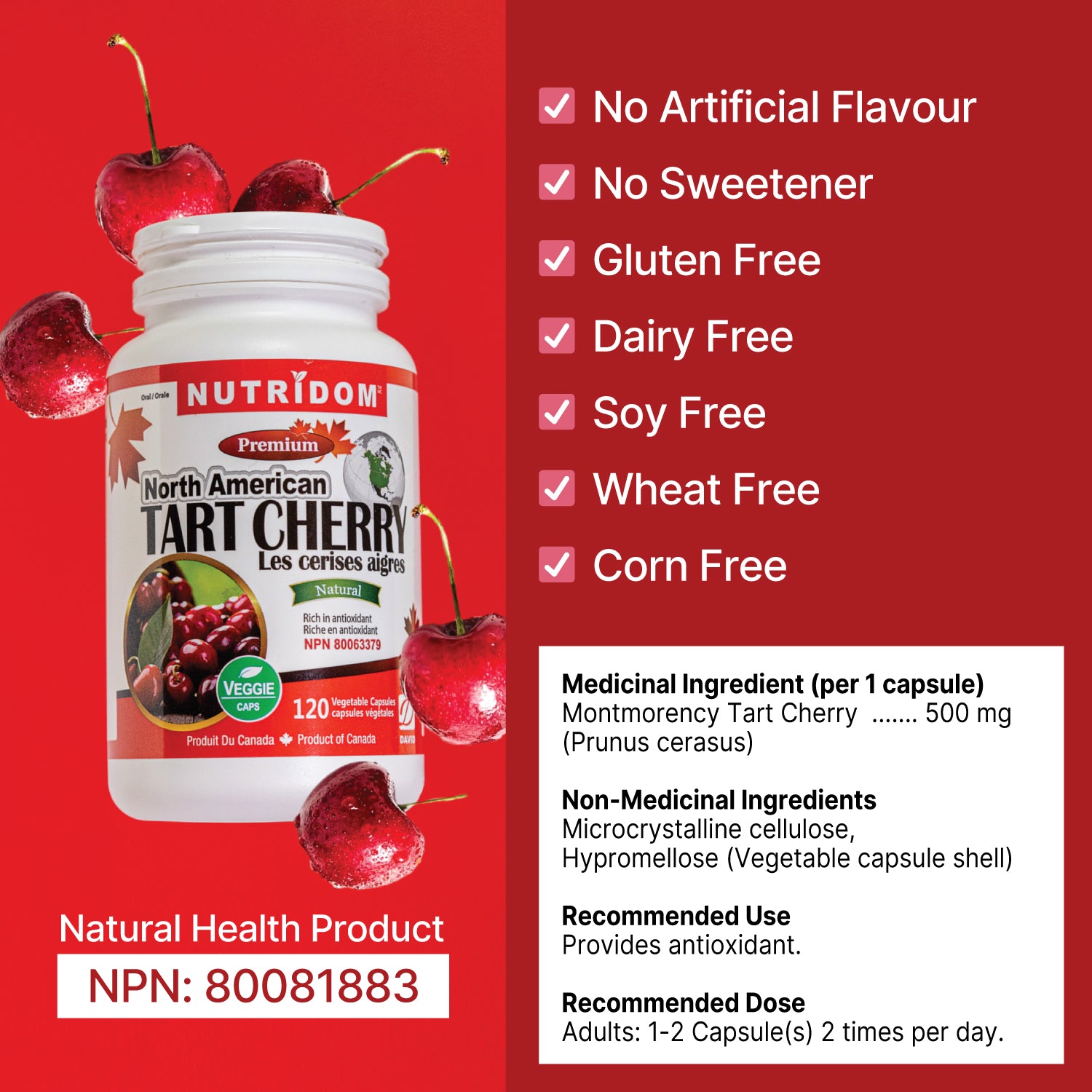 Nutridom Premium Tart Cherry is the first tart cherry capsule product in Canada. It is easy to swallow, and if you like the health benefit but not the sour taste, this product is perfect for you. We only use Montmorency tart cherry, a special kind of tart cherries only grown in Michigan and Wisconsin. Montmorency tart cherry is the most frequently studied types of cherry among researchers for health benefit.