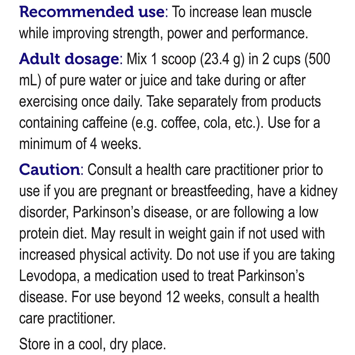 주의사항: 임신 중이거나 수유 중인 경우, 신장 질환이 있는 경우, 사용 전 의료 전문가와 상담하세요. 파킨슨병이 있거나 저단백 식단을 따르고 있는 경우. 신체 활동을 늘리지 않으면 체중이 증가할 수 있습니다. 파킨슨병 치료에 사용되는 약인 레보도파를 복용 중인 경우에는 사용하지 마십시오. 12주 이상 사용시에는 전문의에게 문의하세요. 보건의료인.
