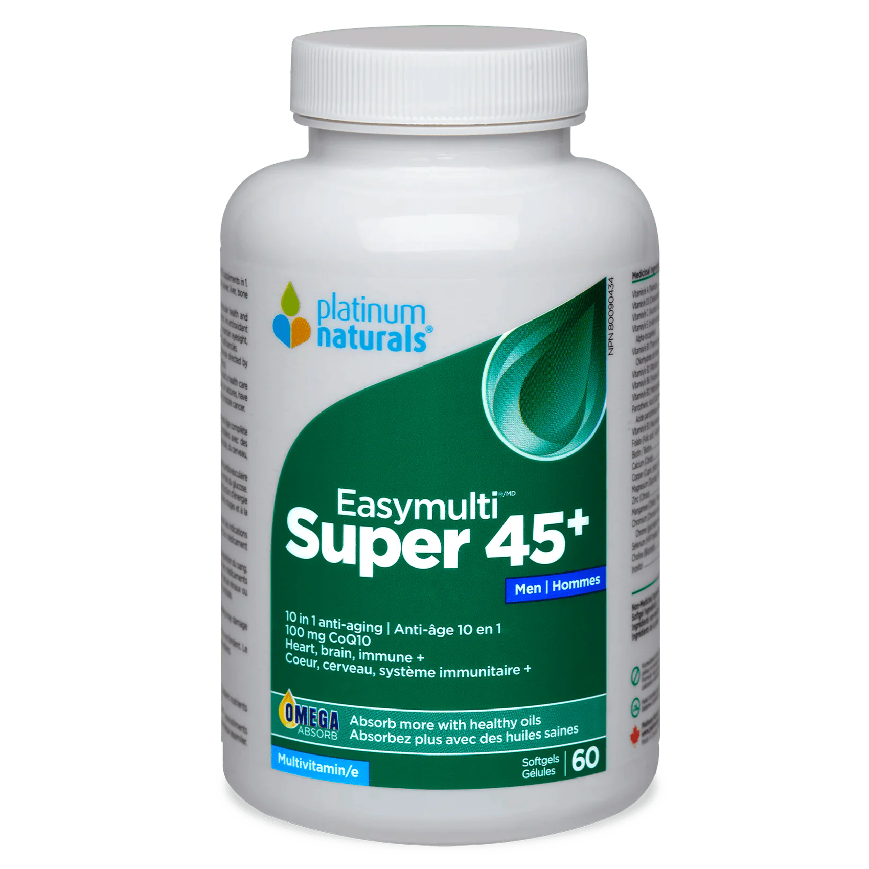 Platinum Naturals Super Easymulti For Men 45 Plus 120 Softgels 유리기 손상으로 인한 세포 퇴화는 나이가 들면서 시력, 청력 및 기억력을 감소시킵니다. 또한 면역 체계를 손상시키고 질병과 감염에 대한 저항력을 낮출 수 있습니다. Super Easymulti 45+ for Men은 비타민, 미네랄, 슈퍼 영양소 및 항산화제의 독특한 제형을 통해 내부 및 외부 노화 징후에 맞서도록 설계되었습니다. 모두 편리한 소프트젤에 들어 있습니다.