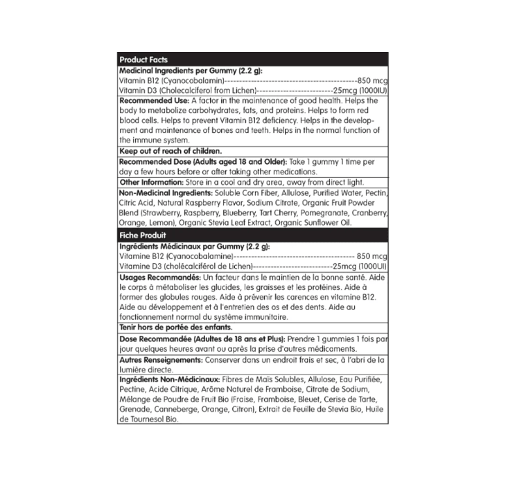 이끼에서 추출한 비건 비타민 D3는 면역 체계를 지원하고, 에너지를 높이고, 긍정적인 기분을 북돋우며, 튼튼한 뼈와 이를 유지하는 데 도움이 됩니다.비타민 B12는 신체의 신진 대사 과정과 적혈구 형성을 돕습니다.권장 복용량(18세 이상 성인): 다른 약을 복용하기 몇 시간 전이나 후에 하루에 1개의 젤리를 복용하세요.1회 제공량당 활성 성분(젤리 1개):