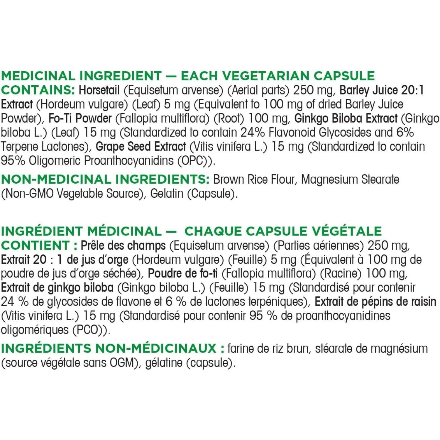 IngredientsMEDICINAL INGREDIENTS — EACH CAPSULE CONTAINS:Horsetail (Equisetum arvense) (Aerial parts) 250 mgBarley Juice 20:1 Extract (Hordeum vulgare) (Leaf) 5 mg (Equivalent to 100 mg of dried Barley Juice Powder)Fo-Ti Powder (Fallopia multiflora) (Root) 100 mgGinkgo Biloba Extract (Ginkgo biloba L.) (Leaf) 15 mg (Standardized to contain 24% Flavonoid Glycosides and 6% Terpene Lactones)Grape Seed Extract (Vitis vinifera L.) 15 mg (Standardized to contain 95% Oligomeric Proanthocyanidins (OPC))NON-MEDICINAL INGREDIENTS:Brown Rice FlourMagnesium Stearate (Non-GMO Vegetable Source)Gelatin (Capsule)