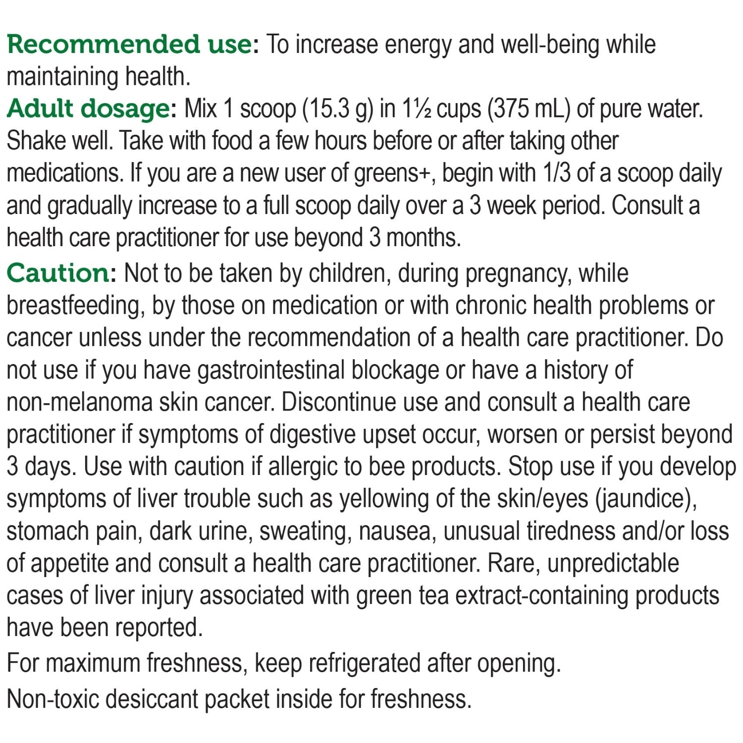 推荐用法:提升能量,促进健康,同时保持健康。成人:将1勺(15.3克)greens+multi+与一杯半(375毫升)纯净水混合。摇匀。服用其他药物前或服用后几小时,随餐服用。如果您是greens+的新用户,请从每日1/3勺开始,在3周内逐渐增加到每日1勺。超过3个月的使用,请咨询保健医生。