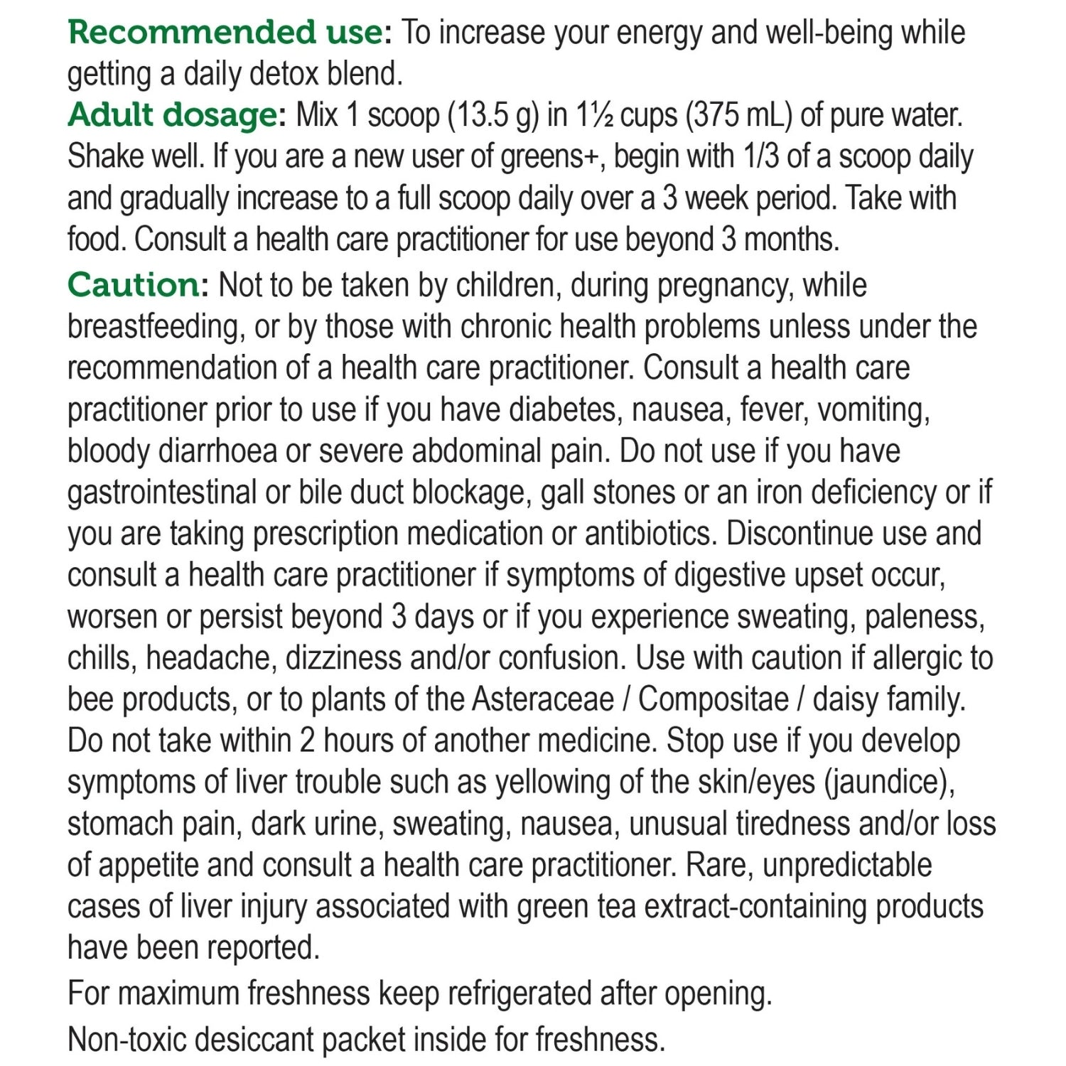 路线 将 1 勺(13.5 克)与 1½ 杯(375 毫升)纯净水混合。摇匀。如果您是 greens+ 的新用户,请从每天 1/3 勺开始,在 3 周内逐渐增加到每天一勺。随餐服用。3 个月后请咨询保健医生。